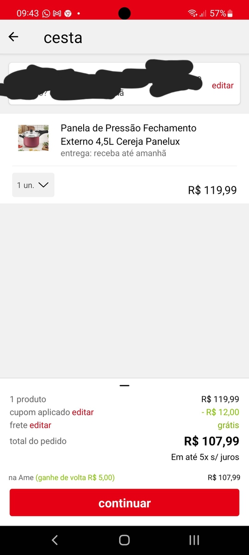 [ CC Ame R$54 ] Panela de Pressão Fechamento Externo 4,5L Cereja Panelux