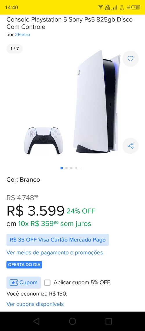 (CC Mercado Pago) Console Playstation 5 Sony Ps5 825gb Disco Com Controle