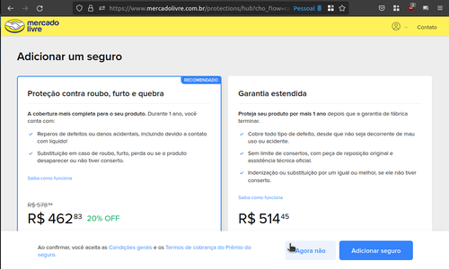 E, falando em seguro, aqui não tá dando pra ir em frente: se usar o botão "Agora Não", dá erro logo ao tentar ir pra tela seguinte ao seguro. 😬