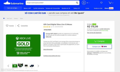 [CC SUB 179,90] - Assinatura Xbox Live Gold (Código digital) 12 Meses - R$200