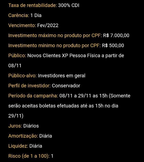 Promoção ótima, se a promoção só tiver prazo limite e não um “lastro máximo” recomendo pegar perto do prazo limite, pois a tendência da SELIC é subir nas próximas reuniões do COPOM e SELIC e CDI andam mais juntos que placa de vídeo e mineradores, assim vai aproveitar muito mais os 300% (que por si só já é uma ótima promoção).