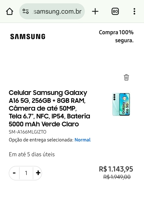 Celular Samsung Galaxy A16 5G, 256GB + 8GB RAM, Câmera de até 50MP, Tela 6.7", NFC, IP54, Bateria 5000 mAh