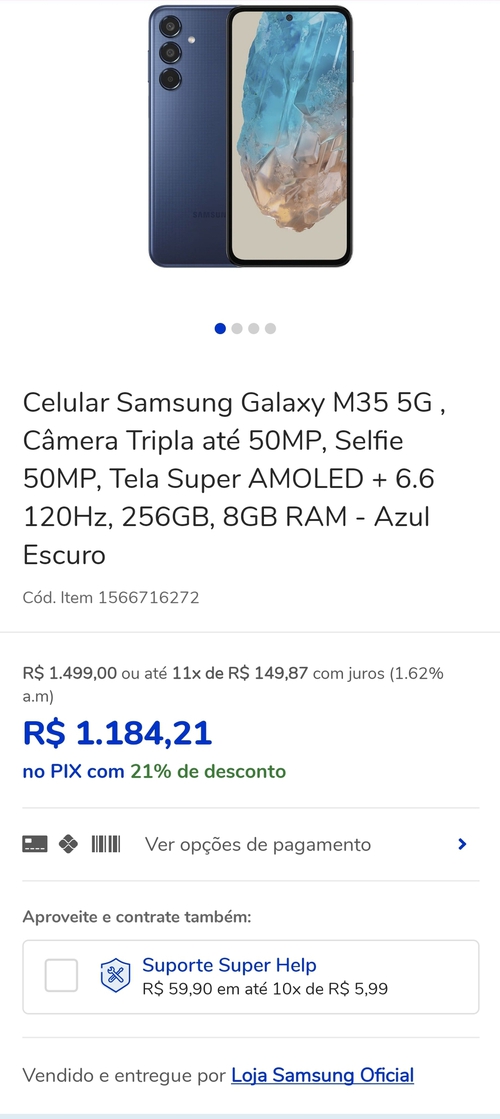 Celular Samsung Galaxy M35 5G , 256GB, 8GB RAMCâmera Tripla até 50MP, Selfie 50MP, Tela Super AMOLED + 6.6 120Hz, - Azul Escuro
