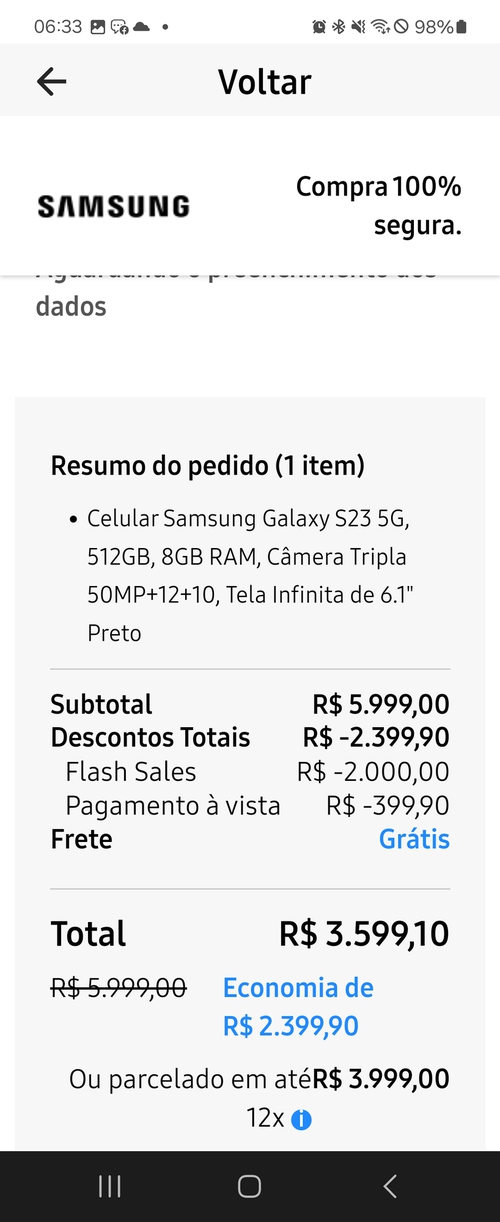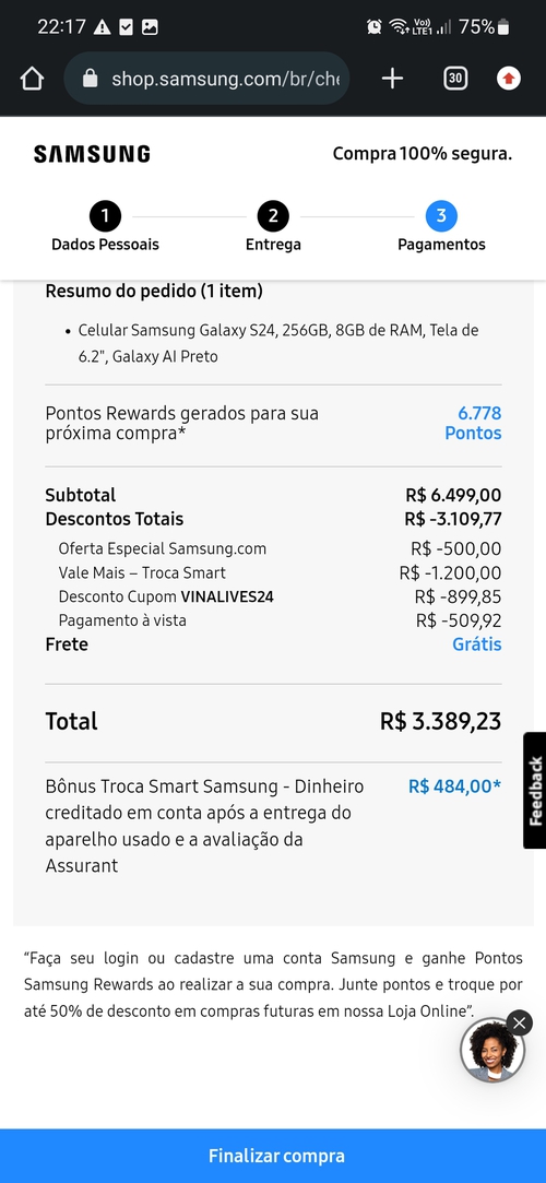 Aqui, oferecendo um s21 inteirão, mostra o bônus do troca smart junto com o do cupom e de pagamento a vista mas só chega em R$ 3.389,23 (sem os pífios 772 que oferecem de depósito pelo s21).