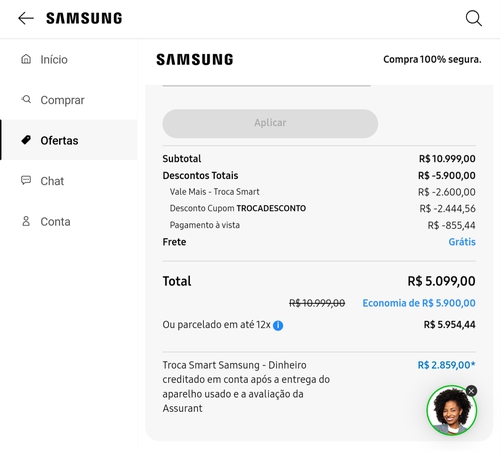Para chegar no valor é necessário entrar pelo app da Samsung e simular uma troca-smart para dá um desconto de 2.600 fora aplicar o cupomno carrinho.E parcelado via mercadopago.