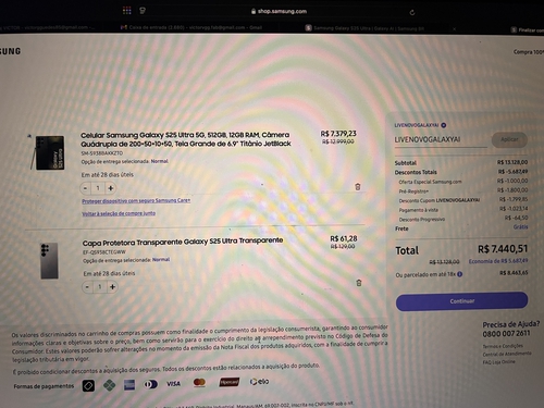 S25 Ultra - 512GB Cupom VEMPROCARRINHO (APP SAMSUNG) + = 7.179,23 - 1435.84 = R$5743,39... Tá melhorando