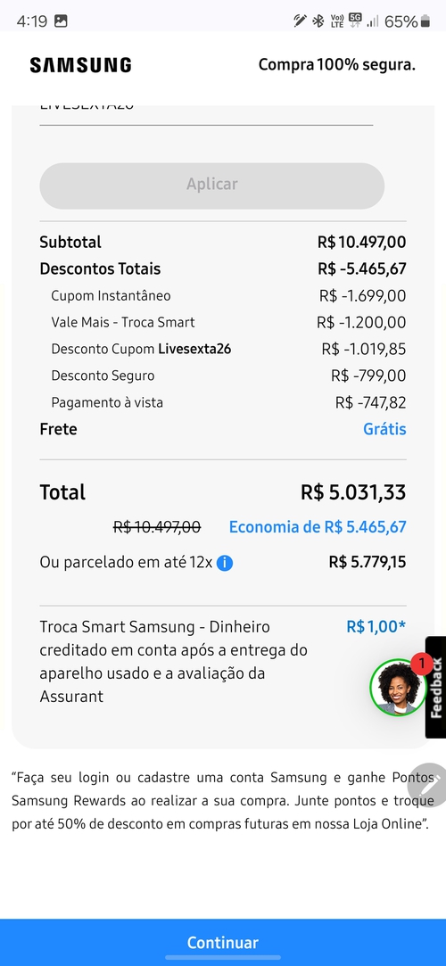 5. No carrinho, aplica o cupom LIVESEXTA26