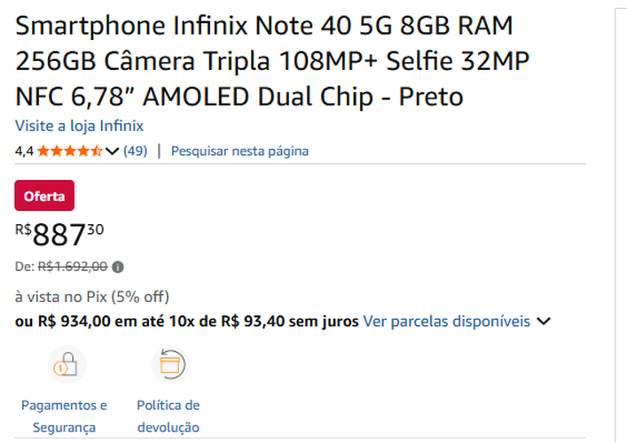 Celular Smartphone Infinix Note 40 5G 8GB RAM 256GB Câmera Tripla 108MP+ Selfie 32MP NFC 6,78” AMOLED Dual Chip - Preto