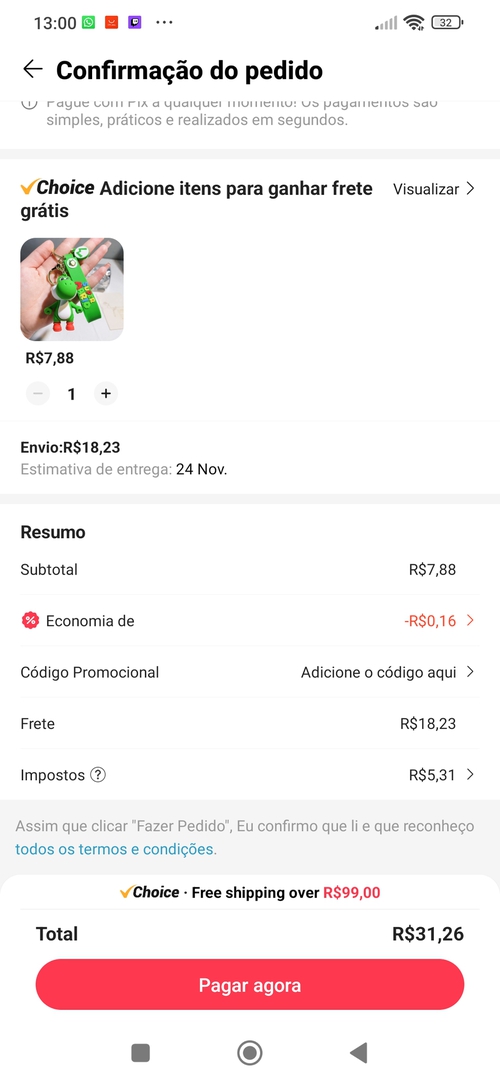 Pra não pagar o frete é só adicionar algum item junto ao carrinho (R$99+) de outro vendedor, selecione o pix (não paga, óbvio) volta e vai em pedidos pendentes e paga somente o item desejado com frete grátis