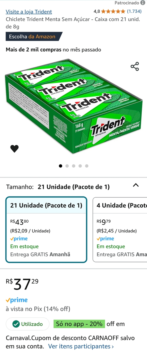 [App] Chiclete Trident Menta Sem Açúcar - Caixa com 21 unid. de 8g [R$1,35.un]