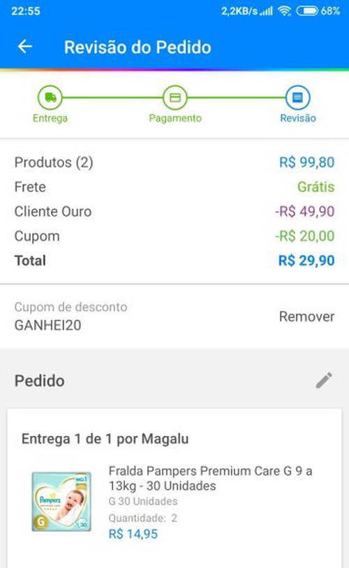 (Cliente Ouro) Fralda Pampers Premium Care G 9 a 13kg - 30 Unidades R$15