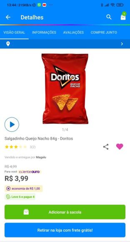[Cliente Ouro] Salgadinho Queijo Nacho 84g - Doritos (Leve 6 e pague 4) R$ 2,66 uni.