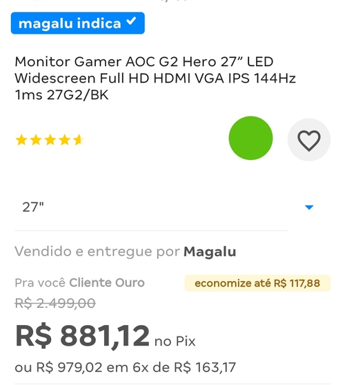 Peguei o meu no fim do ano passado por 900 em 21x sem juros do Santander no ML, excelente monitor, sem problemas até agora... ótimas cores, Gsync funcional, DP, 144hz... visão diagonal excelente, só peca um pouco nos botões do menu e os pés que atrapalham um pouco se estiver com o teclado muito próximo a ele.