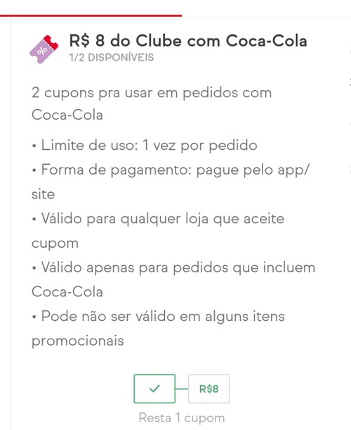 além desses cupons que o ifood está vendendo, existem outros que o ifood está disponibilizando gatuitamente aos poucos nas contas, que também pode ser aplicado em pedidos de qualquer valor e oferece um desconto de 8 reais, é o clube coca cola, para saber se tem acesso a esses cupons, basta clicar na opção de cupons do ifood, não é na opção do clube não, É NA OPÇÃO DE CUPONS: