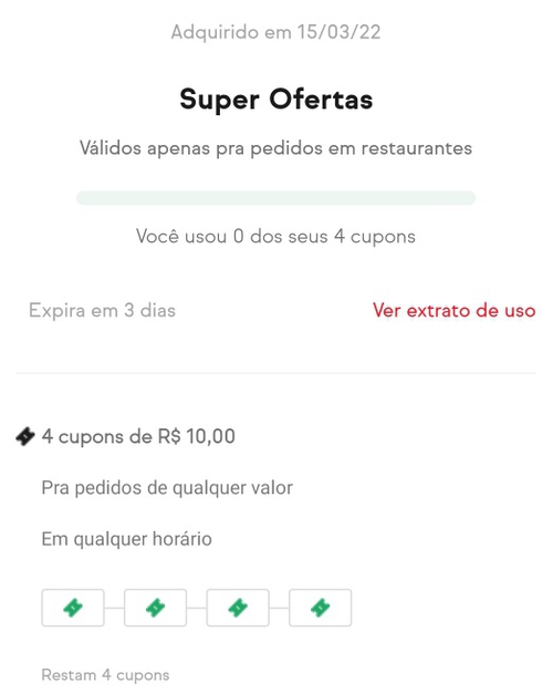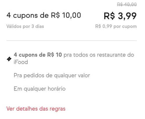 Basta rolar a tela para comprar os cupons que eu informei, são poucos cupons e com validade equivalentes, porém podem ser aplicados em pedidos de qualquer valor, diferente dos cupons adquiridos da forma convencional, que só oferece o desconto de 10 reais em pedidos acima de 100 reais, caso o ifood ainda esteja vendendo cupom de 10 reais que so pode ser aplicado em compras acima de 100 reais, é só não compar agora, esperar um pouco que o ifood volta a oferecer os cupons com desconto em pedidos de qualquer valor.