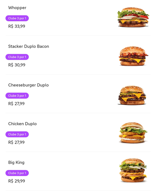 Abra o app iFood e verifique na tela inicial se aparece um banner com a promoção. Se sim, clique nele. Se não, pesquise por Burger King, entre em uma loja e desça até o final, onde irá aparecer as ofertas. São 3 lanches pelo valor
