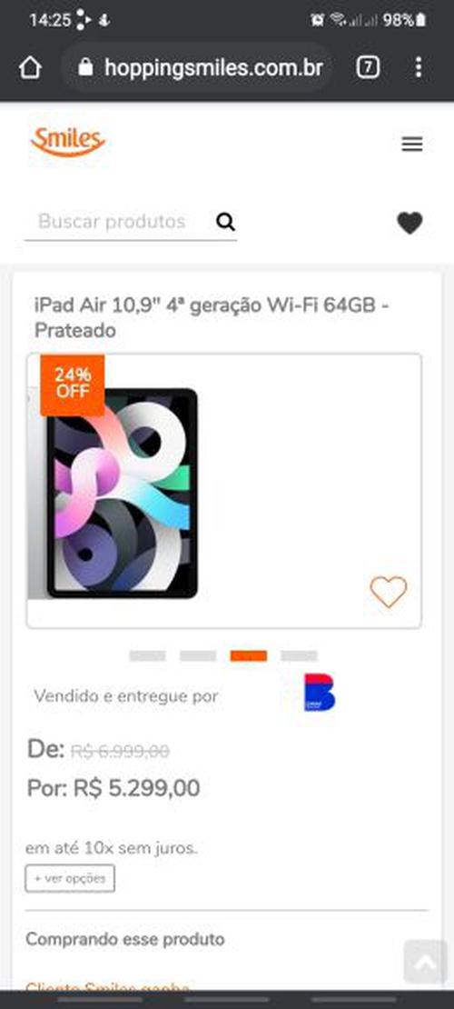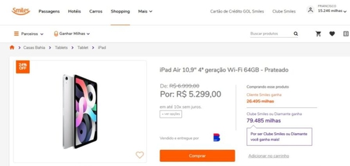 (Clube Smilles) iPad Air 10,9" 4ª geração Wi-Fi 64GB - Prateado | R$ 3560