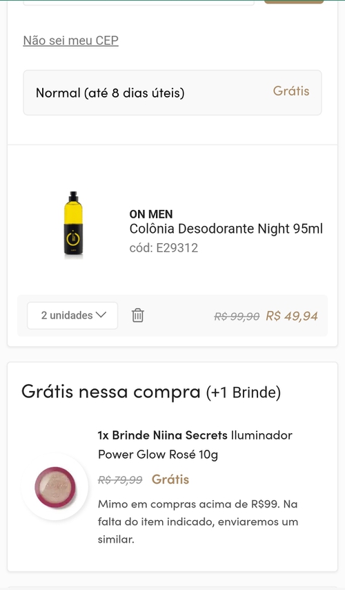Comentários que lembra, guardadas as devidas proporções, o 212 VIP. Recebi uma mensagem de que a Eudora está com frete grátis pra qualquer valor hoje. Quando fui fazer a compra coloquei só um no carrinho, digitei o CEP e realmente deu frete grátis. Na compra de dois pode usar o cupom "HAPPYFRIDAY" pra ganhar de brinde um iluminador cujo preço cheio no site é 79,90, mas está sendo vendido por 39,90.