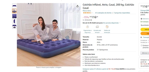 Características:- Marca: Atrio- Modelo: ES289Especificações:- Material: PVC e Veludo- Peso Máximo: 200KG- Medidas: 191 x 137 x 22cm- Válvula de segurança para facilitar na hora de encher/esvaziarRecomendações:- Limpar o local antes de utilizar o colchão- Certificar-se de que não existe nenhum pedrisco ou objeto pontiagudo no local- Não deixar próximo ao fogo- Não usar em águaConteúdo da Embalagem:- Colchão Inflável Atrio ES289 AzulAtenção:- Não acompanha bomba de ar