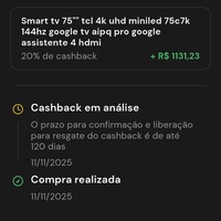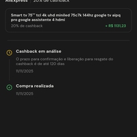 Aqui deu bom também, cashback em análise, no prazo normal que já vem anunciado!
