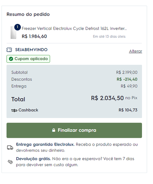 vC receberá um Crédito de Loja no valor equivalente ao valor pago. esse valor fica disponível em até 25 dias após a compra, como crédito na loja Electrolux para ser utilizado em qualquer compra futura sem valor mínimo estipulado, sendo expirado em 120 dias caso não seja utilizado, consulte o regulamento no link a seguir: pelando.com.br/d...29