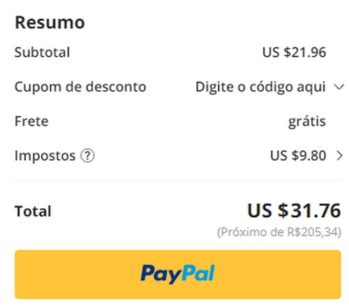 Método de pagamento: A vista no paypal saindo por R$205,34 cupom Cashback de R$10,26