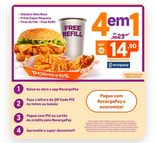 Combo 4 em 1 Popeyes por R$ 14,90 pagando com Recarga Pay