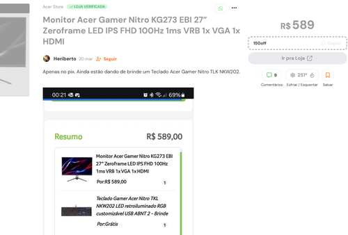Bom preço, embora já tenha custado menos de 600 na loja da Acer mesmo, mas, é o que temos pra hoje, tá valendo.