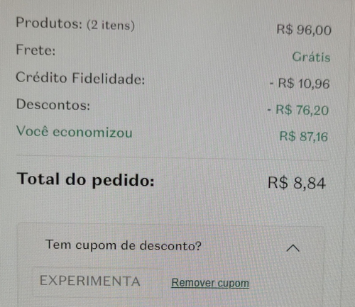TOP IRMÃO! Peguei dois kits masculinos e um feminino. O frete saiu grátis para retirar aqui e ainda resgatei um crédito que eu nem sabia que tinha. Obrigado!!