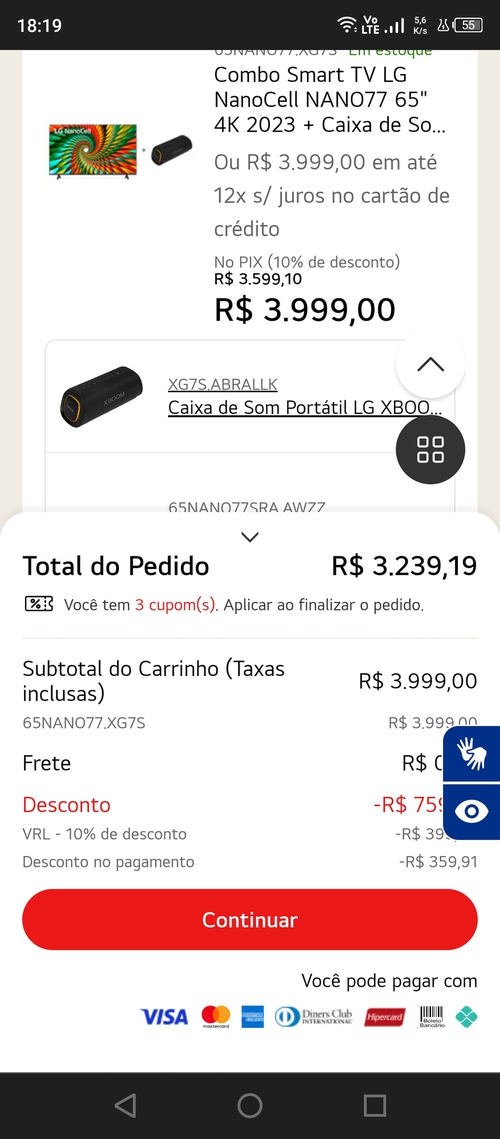 Combo Smart TV LG NanoCell NANO77 65 4K + Caixa de Som Portátil LG XBOOM Go XG7
