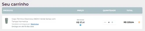 Para chegar no preço que eu informei, é necessário colocar 4 Copo Térmico Electrolux 560ml Verde Sense com Tampa Hermetica no carrinho, aplicar o cupom pelando5 e escolher o pagamento por PIX, vai sair por R$229.64, igual ao print abaixo, ou seja R$57.41 Cada