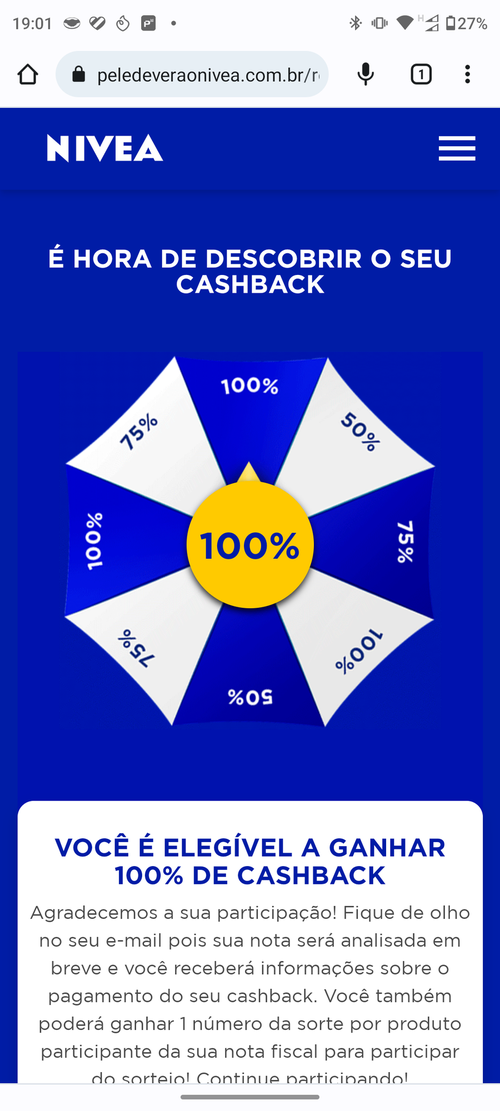 Comprei pela Nivea, já recebi a nota e quando girei a roda ganhei 75% de cashback...LOL...Espero que na analise arrumem pros 100% prometidos.