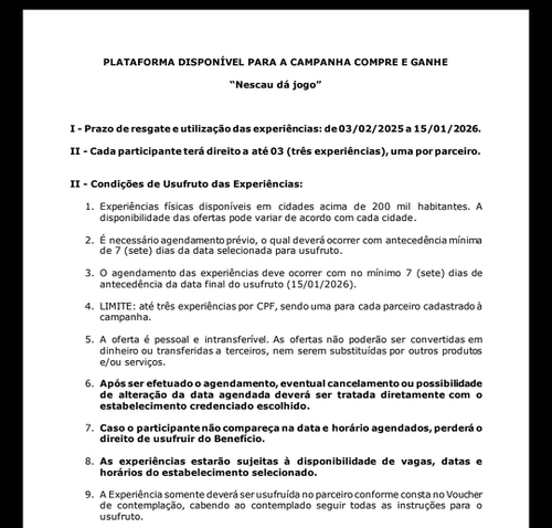 Os brindes que serão distribuídos nesta ação são constituídos por “Vale no valor de R$100,00” que serão utilizados na plataforma de premiação https://promonescaupremios.com.br...r. As experiências serão apresentadas em um catálogo, acessível por meio de um link que será enviado ao e-mail do participante com código único de acesso.