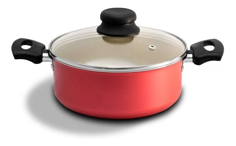 1 und Caçarola Antiaderente Vermelha de 22 cm de diâmetro com tampa de vidro e capacidade para 3,2 litros.