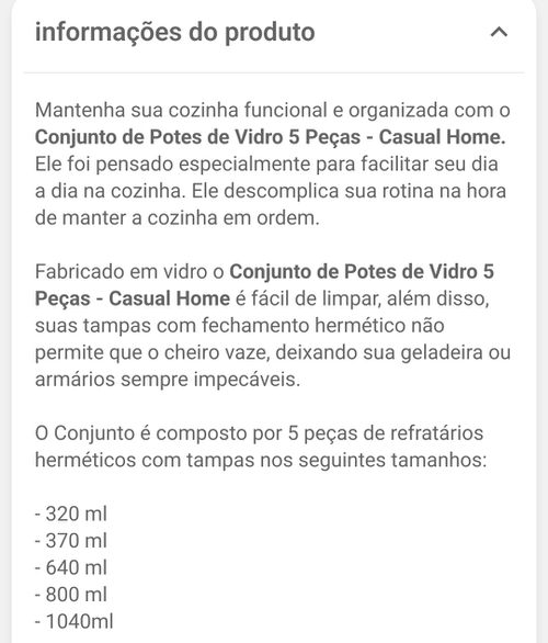 Conjunto de Potes de Vidro 5 Peças - 320 ml, 370 ml, 640 ml, 800 ml, 1040ml - Casual Home
