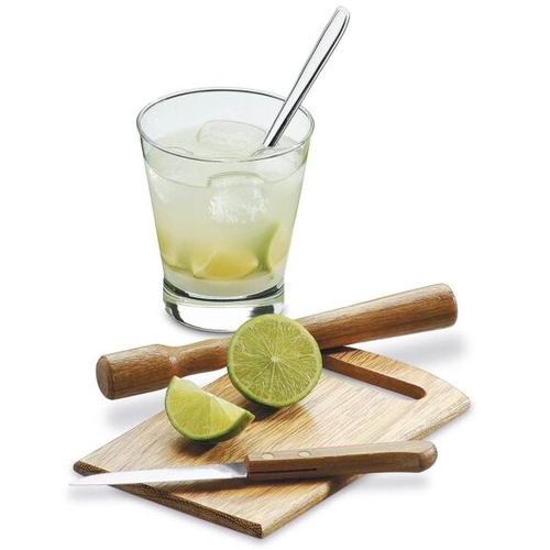 - A tábua de madeira e a faca servem para picar as frutas, o pilão de madeira para amassá-las, o copo de vidro de 350ml para servir a caipirinha e a colher de inox para dar aquela misturadinha