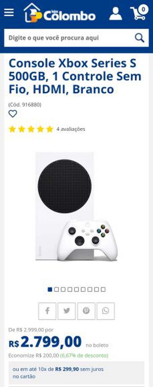 Console Xbox Series S 500GB, 1 Controle Sem Fio | R$ 2.799