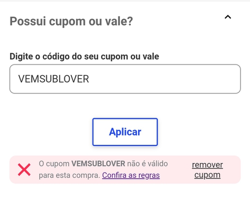 Aqui tá dizendo q o cupom VEMSUBLOVER não é valido para esta compra