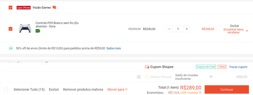 preço final e esse galera, nao esqueçam é preciso pegar o cupom de 60 acima de 339 na aba cupons e aplicar no controle, usem cupom de frete grátis junto