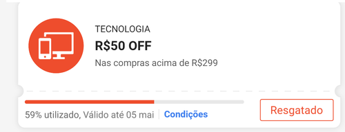 Aqui só apareceu o cupom de desconto de 30 reais em tecnologia. Não aparece de 50 reais.
