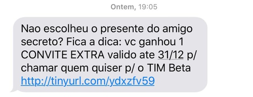 A tim enviou esse SMS ontem. Funcionou pra mim. Mandaram um convite sem finalizar a rodada com essa promoção. Alguém mais recebeu?