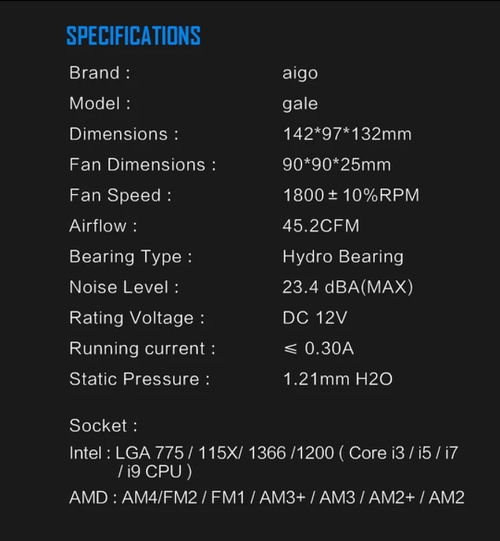 CPU COOLER FAN Aigo Gale, 6 PIPES, 3 FANS, SEM RGB