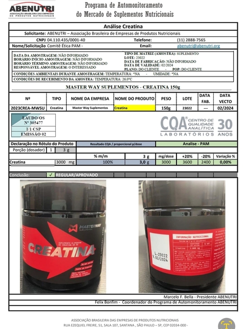 Creatina 100% pura, passou nos testes de laudo ABENUTRI!