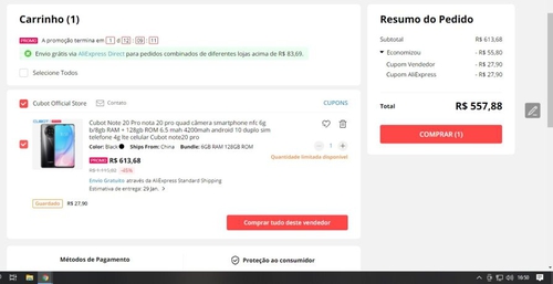 Cubot Note 20 Pro quad camera 6GB de RAM + 128GB ROM 4200mah | R$558
