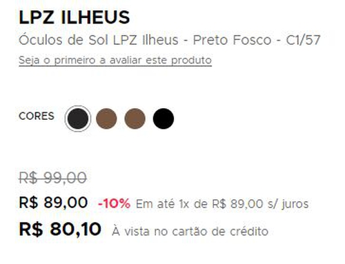 Forma de pagamento: R$80,10 à vista no cartão de crédito