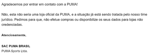 Tinha boletado, mas antes de pagar resolvi entrar em contato com o SAC da Puma. A resposta deles foi a seguinte: