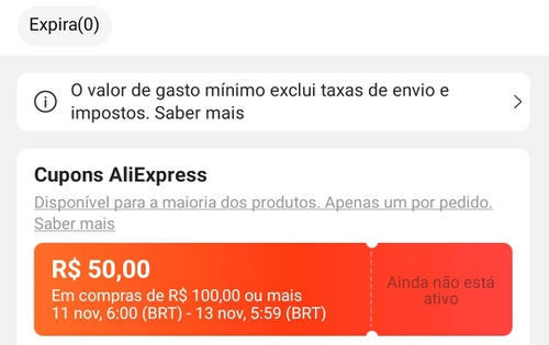 Regaste o cupom no link indicado e aproveite R$ 50,00 em Pedidos acima de R$ 100,00 no Aliexpress, válido para o dia 11/11 (5h).
