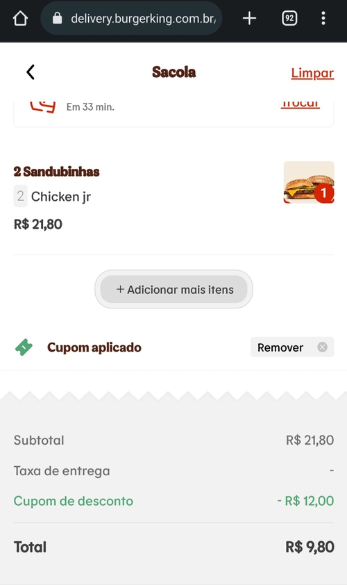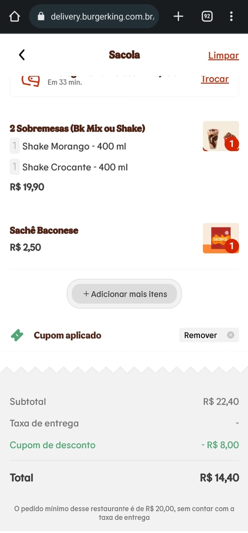 Consegui entrega grátis peguei whoper e maionese por 8 reais, obrigado.