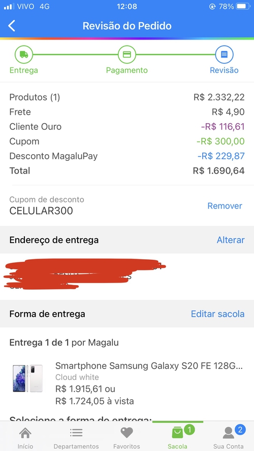[cupom + cliente ouro + MagaluPay] Smartphone Samsung Galaxy S20 FE