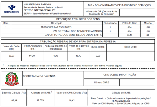 Comprei uma toalha de microfibra de US$6 fora do remessa conforme, olha da taxa do amor. Imposto de Importação = R$33,72 + ICMS = R$18,42 Total = R$52,14. O governo tá metendo a faca e não está nem ai.